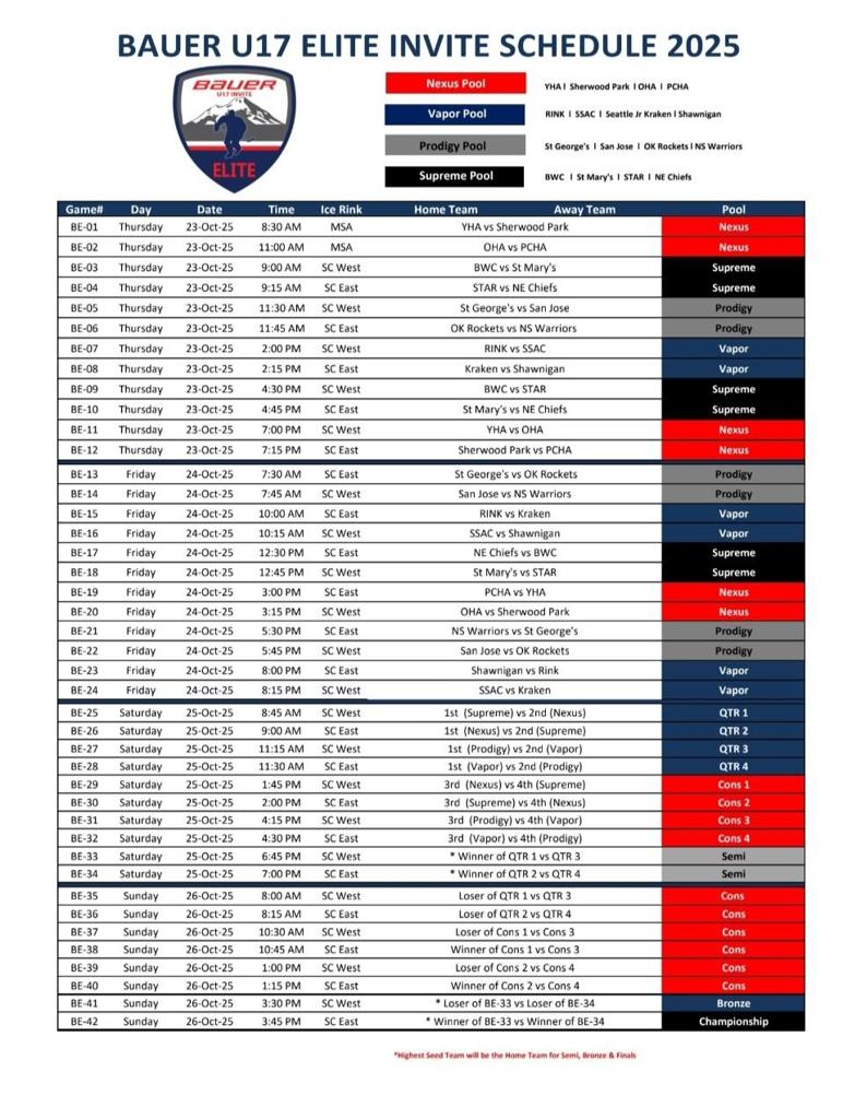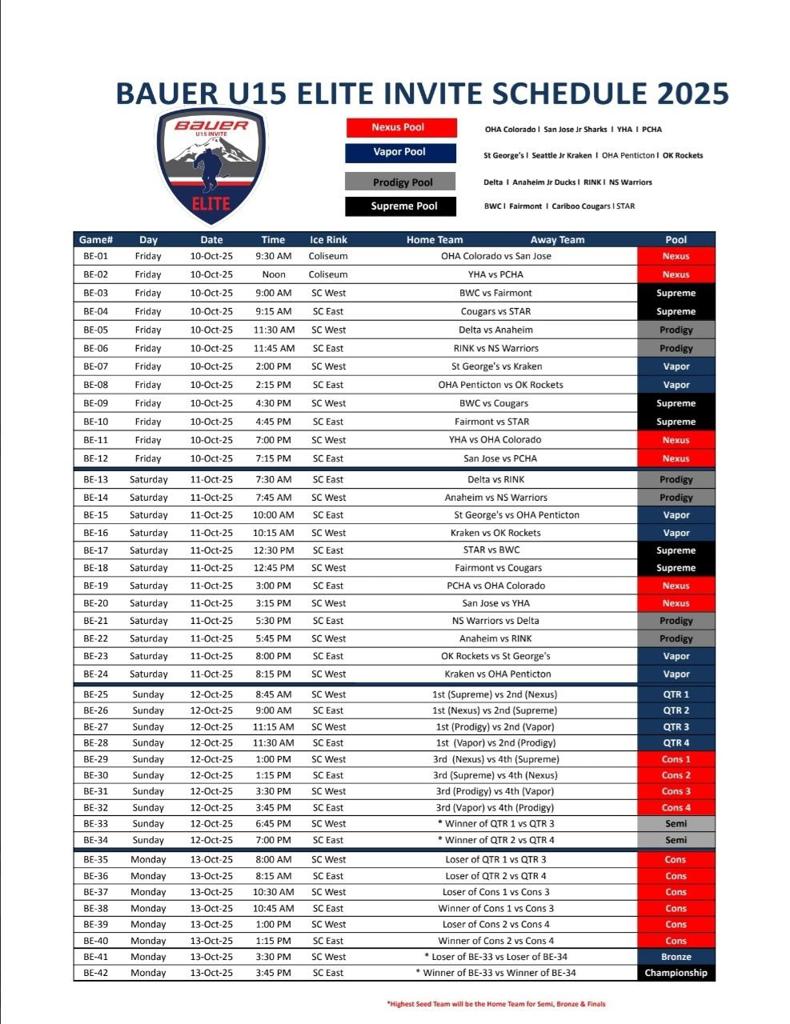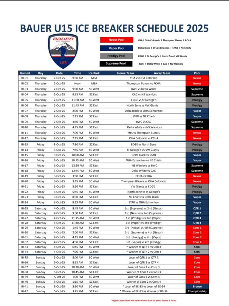 This premier tournament is the first of a series of heavily scouted U15 tournaments in British Columbia, Canada. We will host some of the top elite teams from Western Canada and the USA. The tournament is held on the Canadian Thanksgiving long weekend October 10-13, 2025, and will be hosting 16 teams, through 4 pools from various provinces and states. This is a highly competitive tournament and we look forward to another successful event showcasing elite hockey players.